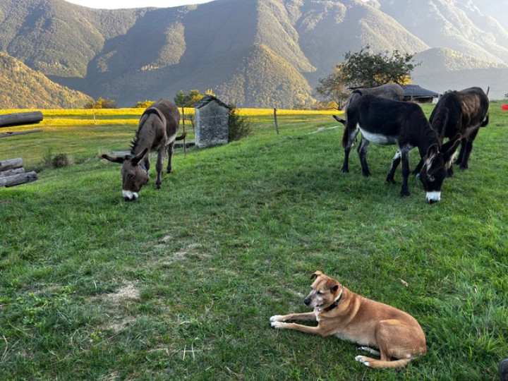 Unsere Esel auf der Sommerweide über dem Dorf, wir geniessen es